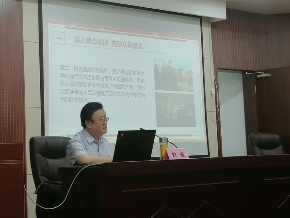 刘宏从全党开展党史学习教育的总体要求出发,并结合个人的学习感悟和实践思考,通过“深入领会论述充分认识意义、认真研读著作全面了解历程、深刻汲取经验准确把握重点、开展党史教育学懂弄通做实”四个方面,向与会的师生回顾了党的百年历史进程。他号召全体师生主动学习党史,强调广大青年学生生逢其时,要以史为鉴,在党史中汲取智慧和力量,以青年力量在党执政百年时谱写新的篇章,创造新的辉煌。