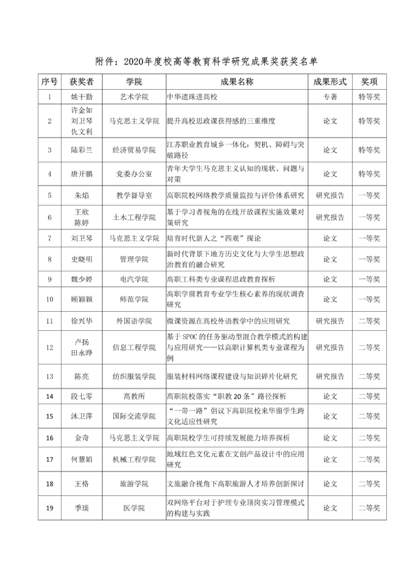 本次评选活动根据《扬州市职业大学高等教育科学研究成果奖评选办法(试行)》组织部署。在个人申报及学院推荐基础上,学校组织专家对申报成果按专著、论文和研究报告进行分类评审,共评出特等奖4项,一等奖6项,二等奖9项。根据评选办法,获得校级高等教育科学研究成果奖的成果,将被择优推荐参加江苏省高等教育科学研究成果奖的评选。