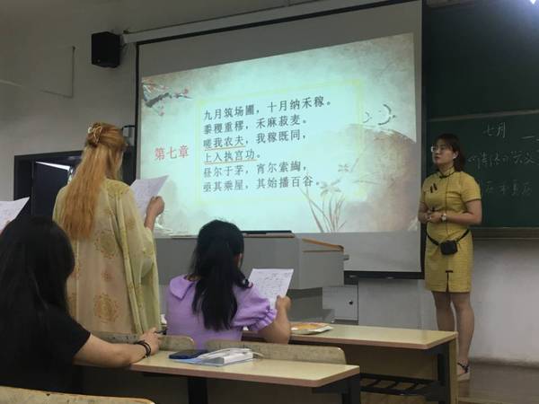 师范学院苏雪婷老师在古代汉语课上讲解了《诗经•七月》,以“七月流火”的含义导入教学,带领同学们共同领略两千多年前的古远诗情,透过《七月•豳风》讲授中华先民的生活质态、人与自然的和谐共生。同学们通过声情并茂的吟诵深入感悟中华文化的源远流长与博大精深,感受和传承先人为我们留下的宝贵的精神财富,进一步树立坚定的文化自信。