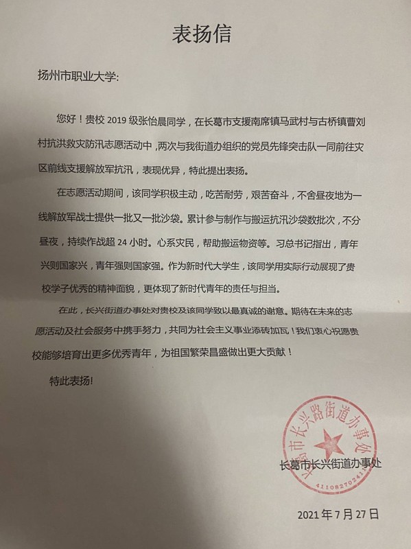 近日学校收到了长葛市长兴街道办发来的表扬信。正如表扬信中所言,“作为新时代大学生,张怡晨用实际行动展现了贵校学子优秀的精神风貌,体现了新时代青年的责任与担当。”