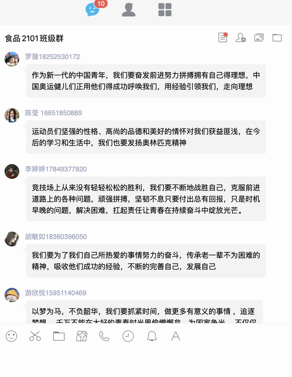 “茅经典的故事告诉我们即使身体有缺陷,也不要轻言放弃。作为新时代大学生,面对困难我们要勇于挑战,将奥运精神融入自己的言行举止中。”药技2101班朱路荣同学说。食品1901班周佳慧同学表示,从奥运健儿身上我们学习到了可贵的品格,在日常学习与工作中我们要做到坚守,当遇到困难挫折时我们要学会坚韧。“我们每个人都应该有梦想,更应该有为了这个梦想而拼搏的勇气。”食品1901班陈晓慧在心中这样筑起信念。食品2102班李竹青、汤宇豪分别以工整的字体写下了自己的观后感……这个下午,学院各班级群被同学们的观后感刷屏了。