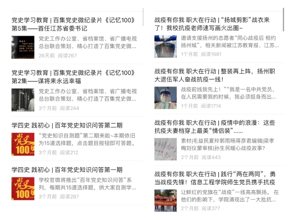 目前,学校官微关注人数达5.7万,从2020年农历大年初二开始每天不间断地推送微信,2020年共推送564期微信,2021年截止10月11日,已推送457期。每一期微信都经过策划、采写、编制、审核、推送,每一个环节都力求严谨、细致、正确,内容素材贴近师生需求、贴近校园生活、服务学校发展大局、助力文明校园建设。官微公众号上的“学习天地”栏目里的“博看期刊”“有声读书”“宪法宣传教育馆”“中国共产党在江苏”为师生提供多样化学习教育素材;“为您服务”栏目里的“全景校园”“校园新闻”“电子校园卡”“校内点餐”让社会大众了解学校的同时,为师生提供贴心服务;“智慧校园”栏目里的“日查日报”“来访请假”“教学调查”方便师生在线填报,做到精准防控。