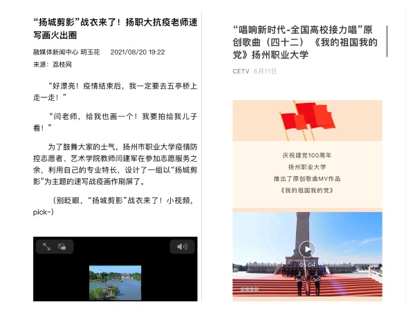 多层面的媒体平台宣传成效显著,在校内积极营造积极作为、勇于担当的干事创业良好氛围的同时,向社会各界展现了扬州职业大学全体师生员工的责任与担当,凸显了学校综合办学实力,极大提升了学校的社会美誉度和影响力。推送的微信先后获江苏省高校校报优秀作品新媒体类二等奖、三等奖;制作的720度全景校园漫游系统,点击量达14.88W;2021年已有82条新闻被省教育厅网站、官方微博、微信公众号“江苏教育发布”采用。