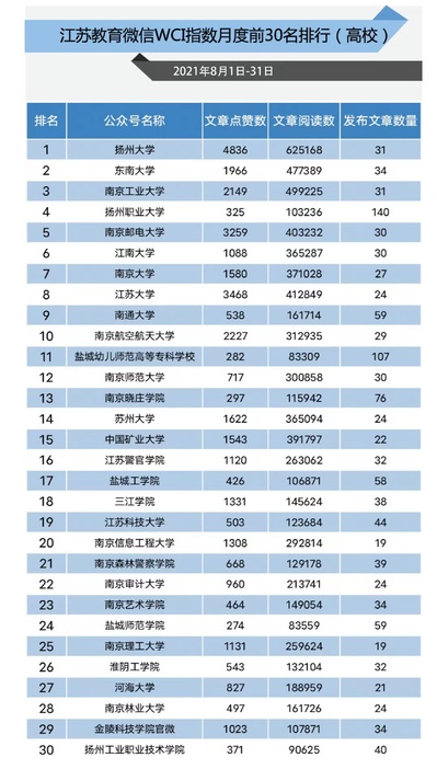 10月9日,江苏省教育厅官方微信“江苏教育发布”对省内教育部门和高校的官方微信传播效果进行了排名。我校官方微信“扬州职业大学”在8月份江苏省教育微信WCI排行榜中位列第4位,这是自我校官方微信于去年3月、5月进入排行榜,官方微博于今年7月进入江苏省教育微博BCI排行榜位列第2位后,再次榜上有名。