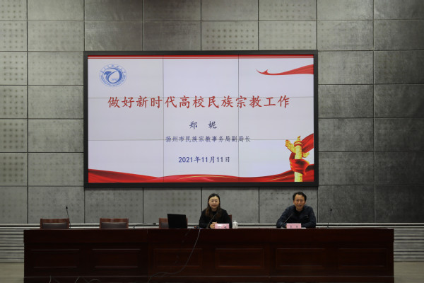 为进一步深化广大师生对党的民族宗教政策的认识,帮助师生树立正确的民族宗教观,11月11日,党委组织(统战)部邀请扬州市民族宗教事务局副局长郑妮来我校作专题讲座,各基层党总支书记,统战委员、辅导员代表聆听了讲座。讲座由校党委委员、组织(统战)部长华炜主持。