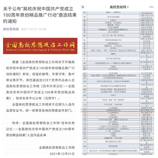 2021年12月31日,全国高校思想政治工作网公布了入选《百年珍贵记忆——全国高校庆祝中国共产党成立100周年原创精品档案》优秀作品名单,我校报送的原创歌曲《我的祖国我的党》成功入选。