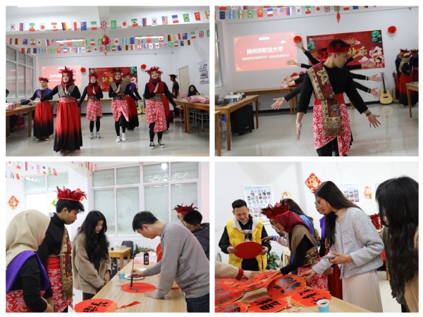 慰问结束后,留校留学生们表演了精彩的歌舞节目,校书画协会副主席王强老师现场书写了春联和福字送给大家,同学们既体会到年的味道和“家”的温暖,又感受到了中国传统文化的丰富与深刻内涵。