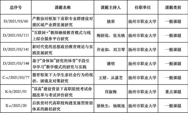 近日,江苏省教育科学规划领导小组办公室公示了省教育科学规划课题评审结果,我校共有7项课题获批立项。其中重点课题1项,一般课题6项,获批数量和质量位居全省同类高校前列。