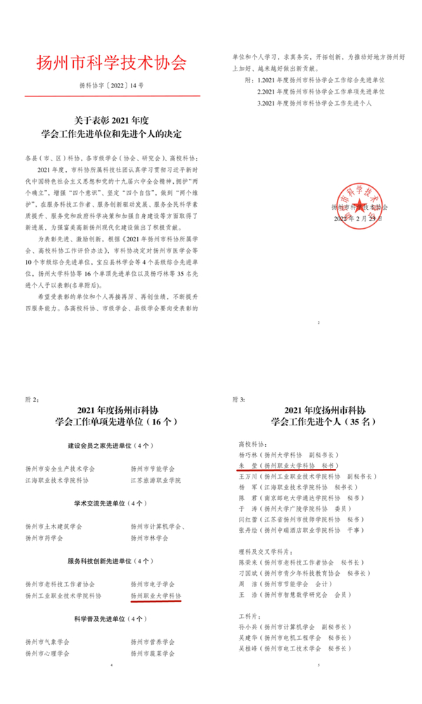 近日,扬州市科学技术协会下发了《关于表彰2021年度学会工作先进单位和先进个人的决定》,我校科协喜获扬州市科协服务科技创新先进单位。
