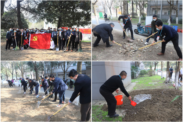 大地万物苏,添绿正当时。为深入贯彻落实习近平总书记“绿水青山就是金山银山”的绿色发展理念,切实加强生态环境保护建设,提升党员社会责任感与环保意识,增强后勤党总支凝聚力,助力绿色学校创建活动,倡导全民植绿护绿爱绿,在植树节来临之际,后勤党总支积极发挥党建引领作用,组织开展“树立环保意识 创建绿色学校”为主题的党日活动。