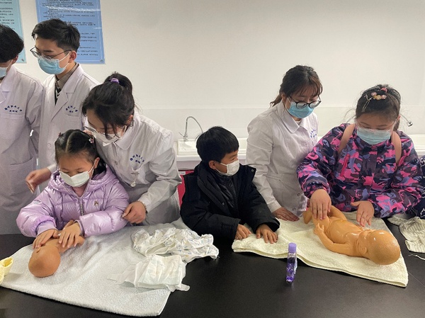 在实践环节,小朋友们分组学习如何抱起新生儿,给新生儿洗澡及日常新生儿护理等技能。在老师和大学生志愿者的指导下每位小朋友都亲身体验了新生儿护理操作。小朋友们学习热情很高,掌握操作技能后,第一时间给自己的爸爸妈妈或者小伙伴现场展示了自己的学习成果。