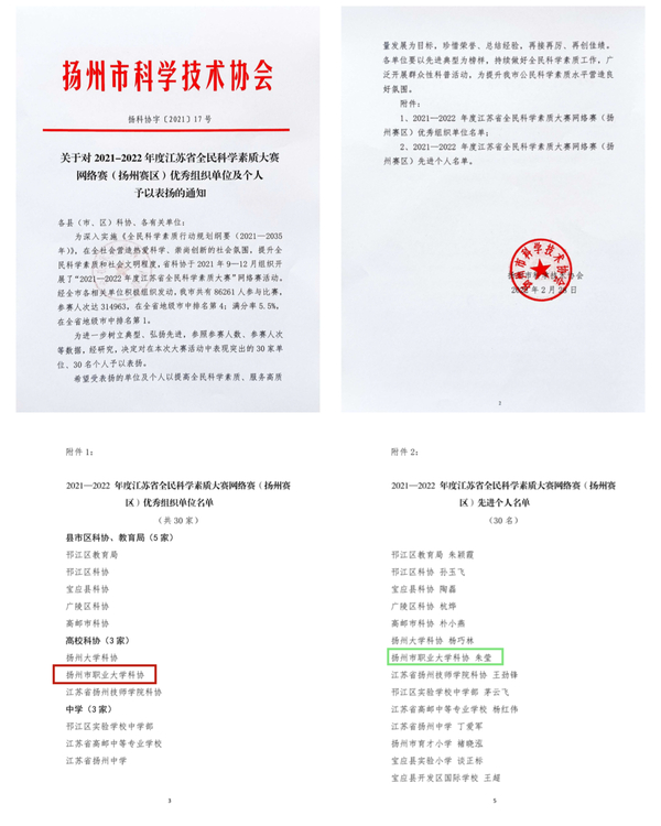 近日,扬州市科学技术协会印发《关于对2021—2022年度江苏省全民科学素质大赛网络赛(扬州赛区)优秀组织单位及个人予以表扬的通知》,全市高校科协组别三家获奖,我校科协排名仅次于扬州大学科协,获扬州赛区高校科协组别优秀组织单位称号。
