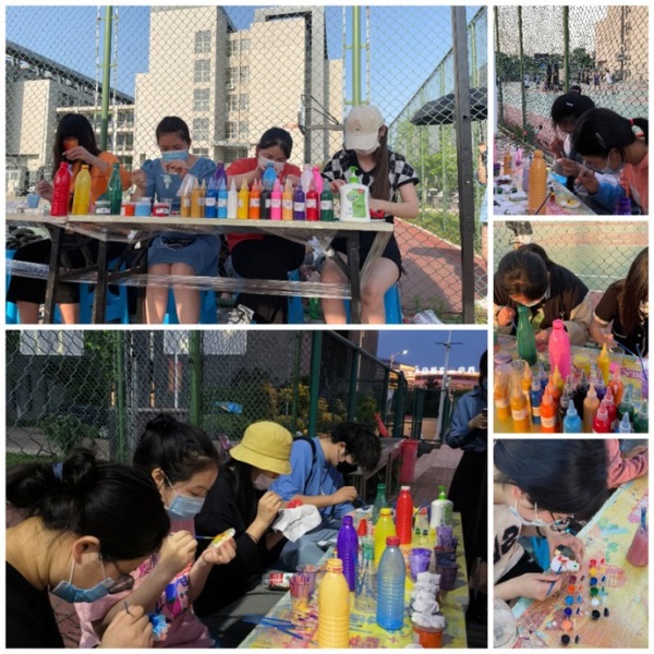 为了让同学们能够尽情享受艺术的快乐,活动当天,院学生会干部早早来到校运动场布置场地,准备好酒精和免洗洗手液,摆上流体熊和石膏娃娃,铺展好作画的染料。活动还没有正式开始,同学们已自觉排起了长长的队伍。专人负责测体温、依次给活动参与者编号……院学生会干部忙得不亦乐乎,各项组织工作井井有条。