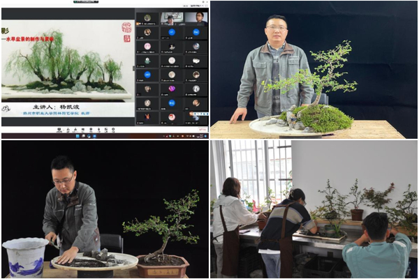 主讲人杨凯波老师师从江苏省非物质文化遗产扬派盆景技艺代表传承人林凤书大师,他借助图文并茂的课件、林凤书先生授课视频带领大家走进了盆景世界。通过生动的讲解、大师艺术作品的展示,同学们逐渐领悟了盆景以植物、山石、土、水等为材料,经过艺术创作和园艺栽培,在盆中典型、集中地塑造大自然的优美景色,达到缩地成寸、小中见大的艺术效果,同时以景抒怀,表现深远的意境。杨凯波详细讲解了水旱盆景制作的基础知识、操作步骤,展示了园林园艺学院师生制作的盆景图片和作品。随后,杨凯波移步实训工坊进行了水旱盆景的制作与展示,园林专业学生代表在现场同步进行了盆景制作演示。