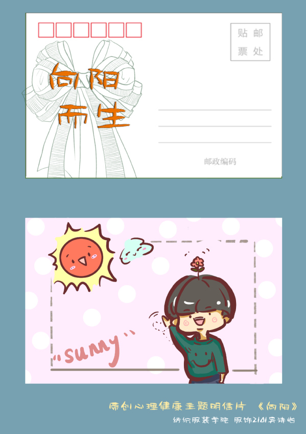 本次明信片DIY活动,引导大学生正确认识生命中的挫折和困难,弘扬在困境中成长、在挫折中蜕变的不屈精神,培育同学们自信自强、不畏困难的积极心态。在开展活动的过程中树立了“我心向阳,共创未来”的理念,吴诗怡同学这样说:“我从没想过可以用明信片记录下心愿,记录下对生活的无限热爱,我感觉在绘制的过程中,充满了自信和感恩,关爱与温暖,同时通过电脑绘图,也磨练了自己的专业技能,希望以后多多开展这样类型的活动。”