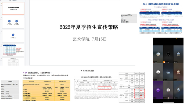 为进一步推进学校及学院招生宣传工作,围绕新形势下的艺术类专业招生新特点,发动教职工引导广大考生对学院专业特色优势的了解,重点推介学院今年新增的美术教育(师范)专业和2个“3+2”贯通培养项目,吸引更多优秀考生报考我校,7月15日上午,艺术学院召开线上2022年艺术类招生宣传政策解读及工作布置会,学院全体班子成员、专业招生和片区招生负责人、线上招生团队相关教师共同参加了本次会议。