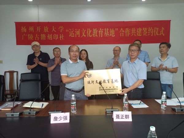 为进一步传承非遗文化,推进扬州运河文化建设,打造开放大学社会教育品牌,7月29日,扬州开放大学和扬州广陵古籍刻印社举办了“运河文化教育基地”合作共建签约活动。广陵古籍刻印社总经理聂正群、党支部书记胡江虹,市教育局职社处周晟出席活动,我校继续教育学院相关负责人,江苏省社会教育名师工作室主持人陈峰等参加活动。