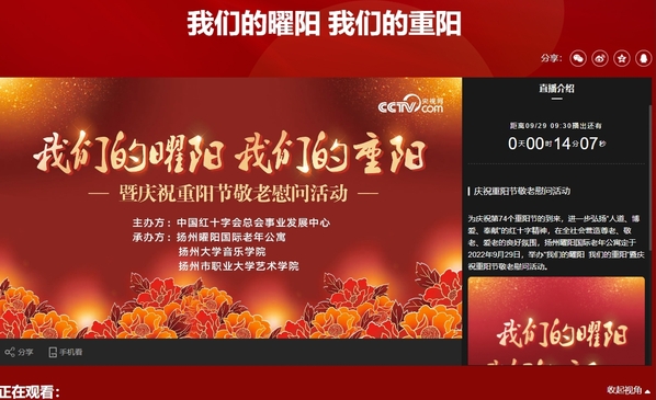 为庆祝第74个重阳节的到来,9月29日,“我们的曜阳 我们的重阳”主题文艺慰问演出在扬州隆重举行,此次活动由中国红十字会总会事业发展中心主办,扬州曜阳国际老年公寓、扬州大学音乐学院与我校艺术学院联合承办,并在央视网同步直播。