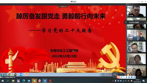 【生物与化工工程学院】10月19日下午,学院全体教职工齐聚云端,学院党总支委员吴美瑾带领大家依次学习了《一图速阅二十大报告》《二十大报告金句》《9个数字!带你速读二十大报告》等内容。大家围绕深刻领会党的二十大精神内涵,切实推动学院各项工作高质量发展进行了深入交流。