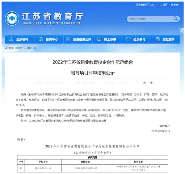 近日,江苏省教育厅发布了《2022年江苏省职业教育校企合作示范组合培育项目评审结果公示》,我校与江苏扬建集团有限公司组建的扬州职大-江苏扬建“教研产服”四位一体校企合作示范组合培育项目获批。