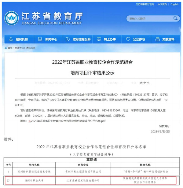 近日,江苏省教育厅公布2022年江苏省职业教育校企合作示范组合培育项目评审结果。我校机械工程学院与江苏亚威机床股份有限公司联合申报的“装备制造类高素质技术技能人才培养校企合作示范组合”入选江苏省职业教育校企合作示范组合培育项目。