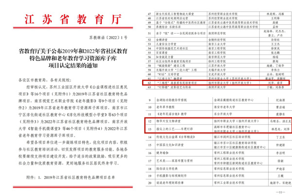 日前,根据《省教育厅关于公布2019年和2022年省社区教育特色品牌和老年教育学习资源库子库项目认定结果的通知》,我校《“三维度”高素质农民培育项目》荣获2022年省教育厅社区教育特色品牌,《物华天宝文物讲堂》和《指尖上的工艺——车逻灯彩》获省教育厅老年教育学习资源库子库项目。