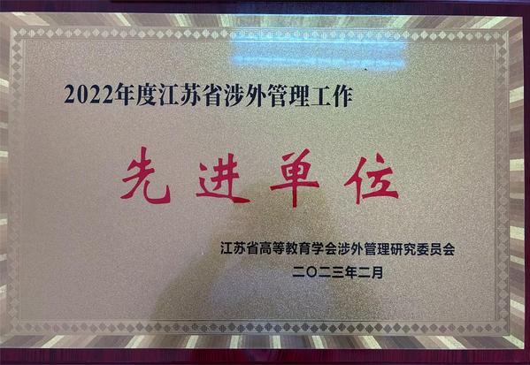 近日,我校参加了在镇江举办的江苏省高等教育学会涉外管理研究委员会2022年年会暨新时代高等教育涉外管理的机遇与挑战研讨会。会上公布了2022年涉外管理工作先进单位和个人,我校荣获“2022年度江苏省涉外管理工作先进单位”荣誉称号。