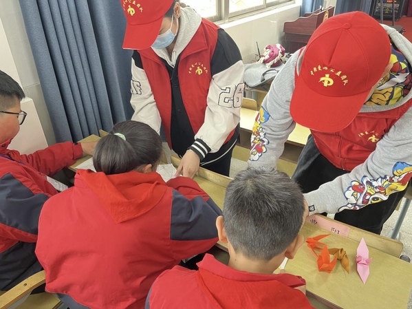 4月6日,管理学院创新创业团队到江都郭村中心小学进行“坚守公益初心 奉献青春力量”爱心捐赠仪式,与孩子们一起折叠千纸鹤缅怀革命先烈。