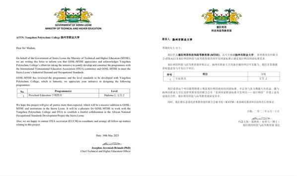 近日,我校收到了非洲国家塞拉利昂科技与高等教育部部长约瑟夫斯·耶利米·布里马博士的来函,师范学院厉爱民、金本能牵头申报的“非洲国家职业标准开发项目——塞拉利昂”获得立项,本次立项的为“学前教育(文凭2)”的国家职业标准开发项目。立项建设单位的遴选工作由世界教育组织联合会(ITEA)于今年3月份组织开展,我校能够在国内众多职业院校竞争中脱颖而出,并能够得到塞拉利昂教育部的认可,也充分说明了学校整体办学水平的进一步提升。