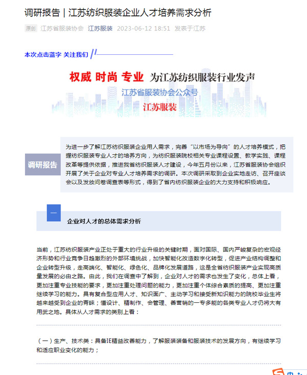 近日,江苏省服装协会在其公众号《江苏服装》发布了《江苏纺织服装企业人才培养需求分析》的调研报告,此次调研由我校纺织服装学院发起,目的是进行新一轮人培方案修订,进行行业企业人才需求调研,得到省服装协会大力支持,龚慧娟会长亲自部署调研工作,今年5月初,协会发布调研通知,并以企业实地走访、召开座谈会以及发放问卷调查表等形式进行,得到了省内纺织服装企业的大力支持和积极响应。