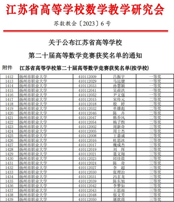 由江苏省高等学校数学教学研究会主办的2023年江苏省高等学校第二十届高等数学竞赛于近日公布了竞赛结果。我校共有28人获奖,其中吕振宇、马元健等5位同学获一等奖,宋传元、殷婷等6位同学获二等奖,周新奇、周士杰等17位同学获三等奖。