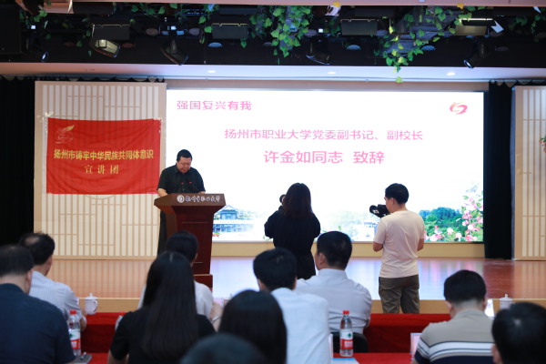 徐永泰在讲话中表示,扬州市职业大学是全市第一个铸牢中华民族共同体意识教育实践基地,在全市高等院校率先开展了一系列教育实践活动,教育援疆工作也取得了非凡成绩。学校成立了红心向党故事宣讲团,开展宣讲活动引导青年大学生涵养爱国之情、砥砺强国之志。今天,铸牢中华民族共同体意识宣讲团走进职大开展首次宣讲,宣讲团成员与红心向党宣讲团学生同台,讲“总书记讲过的民族团结进步故事”。校地共用平台、共享资源、共同合作,打造构筑中华民族共有精神家园新模式。
