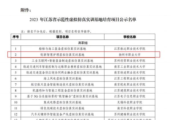 近期,2023年江苏省示范性虚拟仿真实训基地培育项目遴选结果公示,经过专家评审,我校申报的“创新智慧护理虚拟仿真实训基地”成功入选省级职业教育示范性虚拟实训基地建设培育项目。