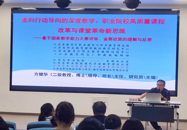 开班仪式结束后,方健华为学员作了题为《走向行动导向的深度教学:职业院校高质量课程改革与课堂革命新思维》的辅导报告。报告精彩纷呈,语言诙谐幽默,既有理论的深度剖析,又有案例的实践启发,所有参训学员听讲专心,意犹未尽。