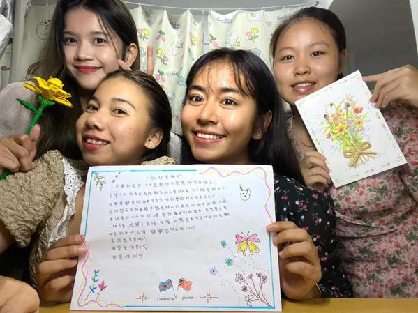 感恩点滴,师泽如光。来自柬埔寨的李丽、来自印尼的齐尼和他们的小伙伴们共同设计了教师节贺卡,一行行工整的汉字里是一句句真情的感谢。