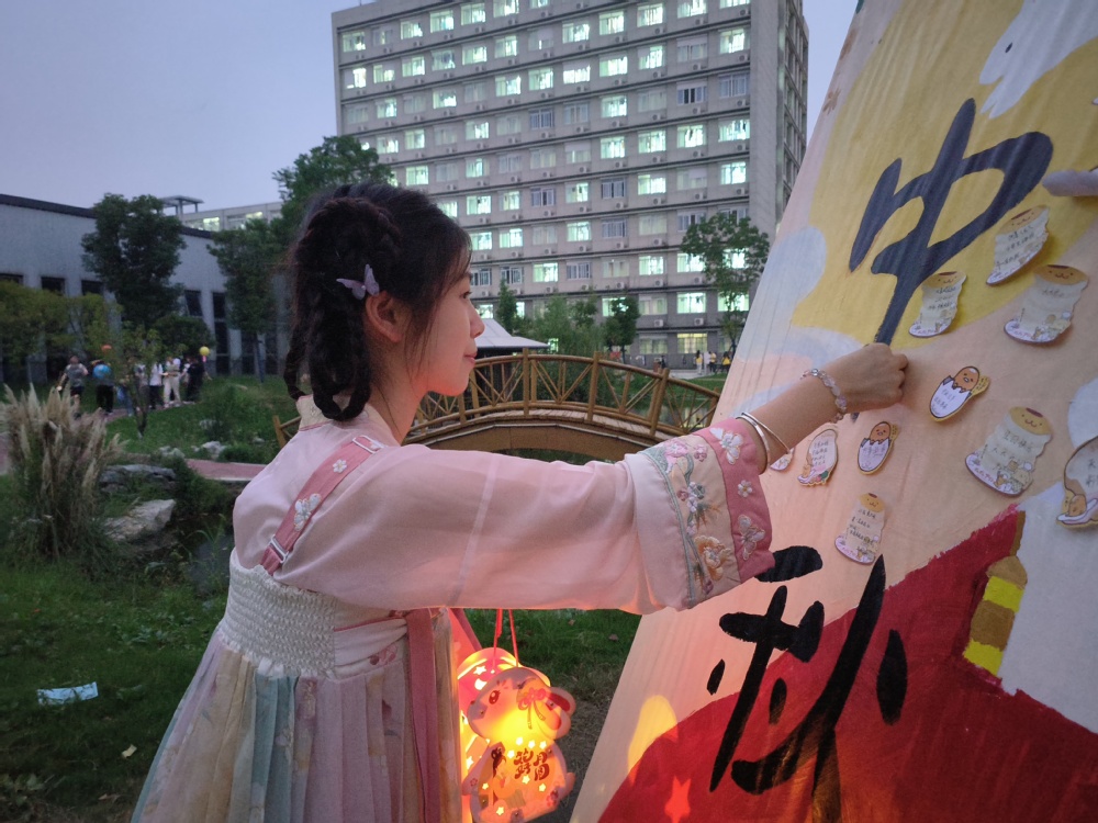 “明月几时有?把酒问青天”“举杯邀明月,对影成三人”“天下三分明月夜,二分无赖是扬州”……9月27日下午,我校生活区生态湖边人群熙攘,热闹非凡。一串串花灯悬挂在亭阁树间,身着汉服的年轻学子驻足湖边观灯猜谜,这是我校国潮中秋雅集的活动现场。