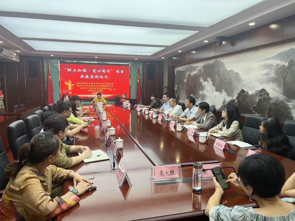 近日,我校党外知识分子联谊会(职大知联会)与扬州市平安志愿者总会高职院校分会、扬州市广陵区青春志愿者协会在崇德楼316会议室举行共建签约活动。校党委副书记陈亚鸿出席并讲话,校党委委员、组织(统战)部部长华炜,机关党总支负责人和校知联会部分会员参加了此次活动。