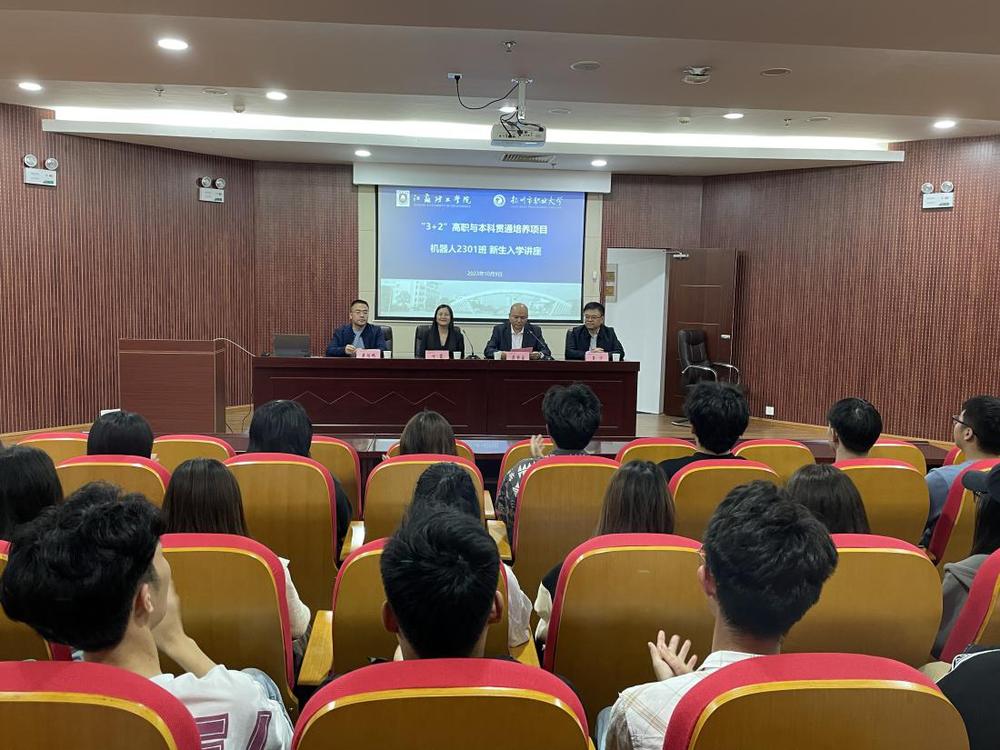 10月9日,我校和江苏理工学院“3+2”现代职教体系贯通培养项目2023级新生入学讲座在图书馆报告厅顺利举行。学校特邀江苏理工学院副校长叶霞为2023级工业机器人专业3+2班全体新生开讲,党委委员、副校长吴书安主持讲座,江苏理工学院机械工程学院相关负责人、我校机械工程学院相关负责人、教师代表以及2023级新生参加了本次讲座。