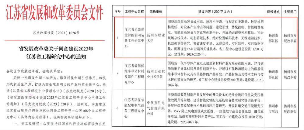 近日,江苏省发展和改革委员会对2023年拟建设江苏省工程研究中心进行公示,我校电气与汽车工程学院申报的“江苏省机器视觉智能驱动装备工程研究中心”获批立项,截至目前,我校拥有3家省级工程研究中心。