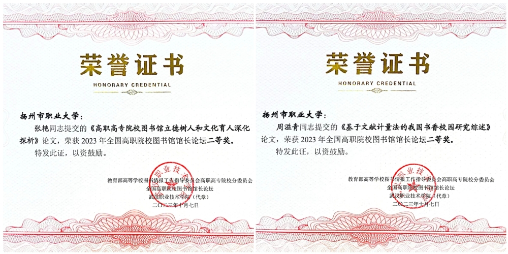 近日,在教育部高校图工委高职高专院校分委员会组织的2023 年全国高职院校图书馆馆长论坛案例与论文征集活动中,我校图书馆馆长张艳的论文《高职高专院校图书馆立德树人和文化育人深化探析》和馆员周溢青的论文《基于文献计量法的我国书香校园研究综述》分别荣获二等奖。