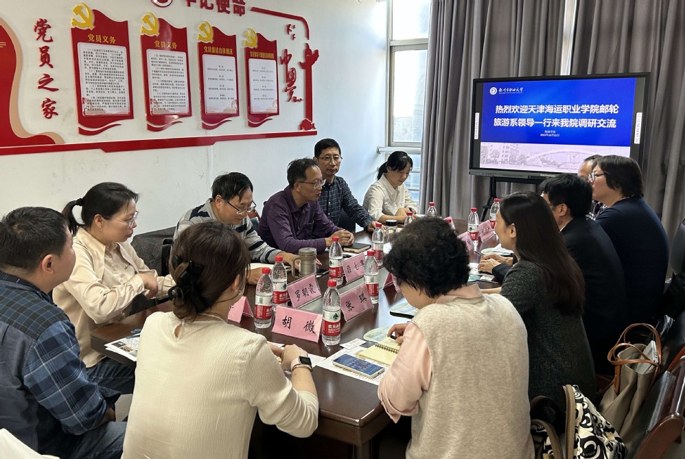 近日,天津海运职业学院邮轮旅游系党支部书记、主任单朝辉一行6人来我校旅游学院调研交流,旅游学院党总支副书记、院长张志祥主持座谈会,旅游学院党政领导班子全体成员参加了会议。