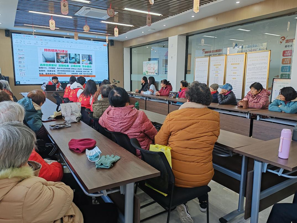学生志愿者团队结合所学专业知识,分工合作,由相关专业老师审核完善宣讲内容,制作幻灯片等宣讲材料。朱诗文同学就“房屋漏水检测”相关问题为社区居民进行了详细科普;徐李祥同学则根据漏水问题的不同情况给出了预防建议与维护要点;陈正洲同学利用一则“装修前的防水工作”相关视频,具体讲解了厨房防水层的做法,以及地漏、泄水坡、门槛石的作用等。