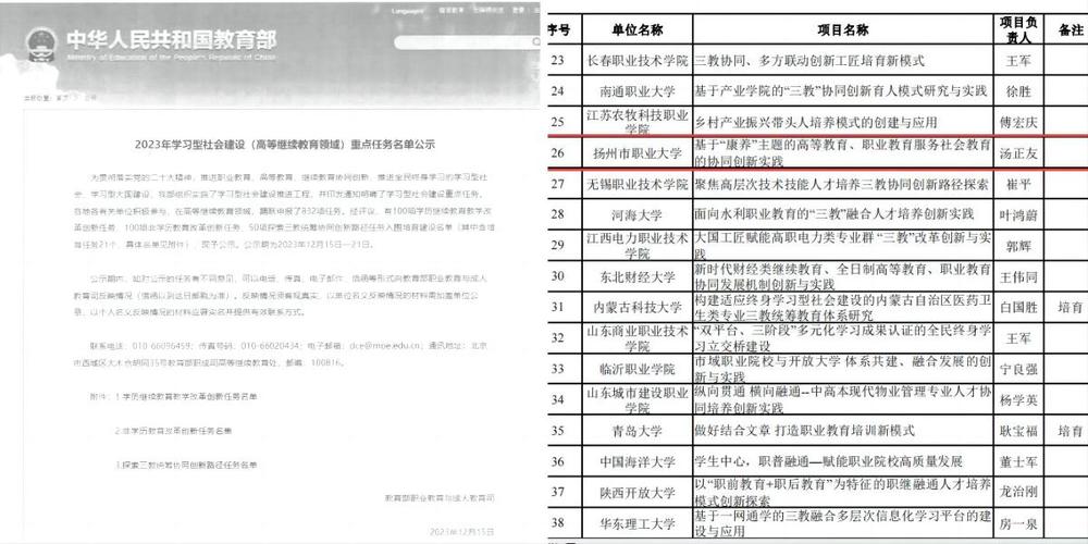 日前,教育部职成司公布了2023年学习型社会建设(高等继续教育领域)重点任务名单,我校“基于‘康养’主题的高等教育、职业教育服务社会教育的协同创新实践”项目成功入选“三教”统筹协同创新路径任务建设名单。