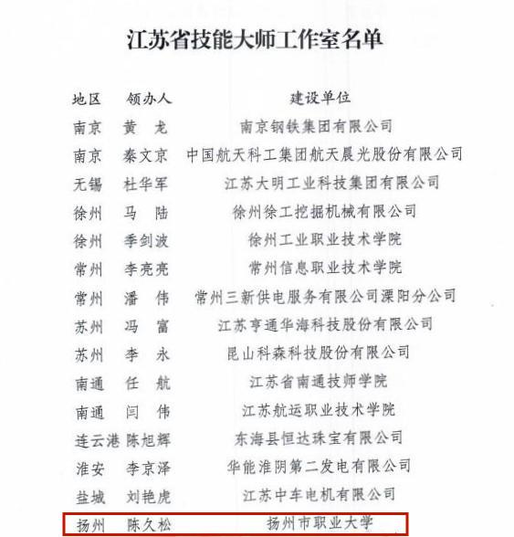 近日,江苏省人力资源和社会保障厅公布了2024年江苏省高技能人才重点项目评审结果,我校陈久松工作室入选江苏省技能大师工作室。据悉,全省共立项建设20个省级技能大师工作室,仅有6所高职院校入选。