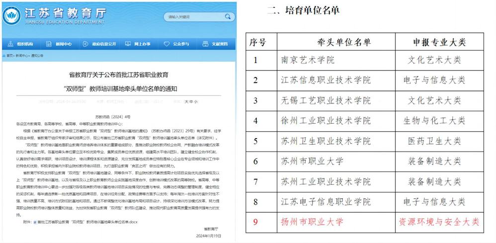 根据《省教育厅办公室关于申报江苏省职业教育“双师型”教师培训基地的通知》有关要求,经学校自主申报,省教育厅组织专家评审和结果公示,我校被评为首批江苏省职业教育“双师型”教师培训基地牵头单位(资源环境与安全大类)。