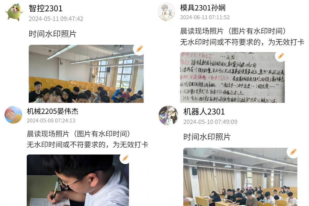 本次文明课堂打卡活动包括“晨读打卡活动”和“前排入座打卡活动”,学院学生和班集体积极踊跃地参与到活动中来。在“晨读打卡活动”中,同学们逐渐养成良好的阅读习惯,提高了学习效率。活动开展一个多月以来,大一大二同学累计近1300人次参加,大家提前至少15分钟到达上课教室,上传打卡照片,有的晒出密密麻麻的学习笔记,有的展现精神饱满的学习状态。机械2202梁婉、机械2204张宇轩、机械2302刘文杰等同学自活动开展起每一天都参与晨读打卡,周末节假日依然坚持早起学习,在同学们中树立了榜样。智控2301寇恒达同学参与晨读打卡近40次,他的学习精神激励了班级其他同学,智控2301全班近200人次加入到晨读打卡队伍中。