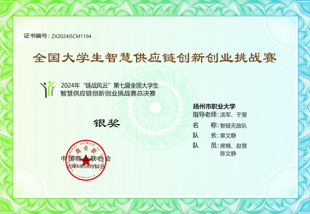 近日,由中国商业联合会主办的2024年“链战风云”第七届全国大学生智慧供应链创新创业挑战赛总决赛圆满落下帷幕,本次决赛高职组共有50支队伍参赛,我校管理学院智链无敌队斩获银奖。