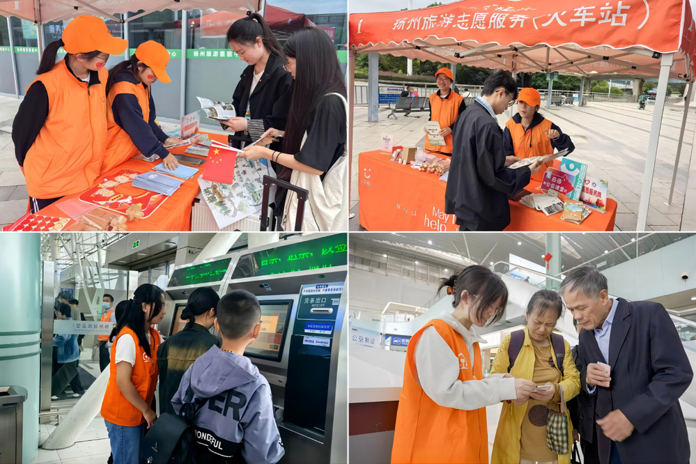 在国庆75周年到来之际,团团公益服务队的队员们牺牲国庆休息的时间,身穿橙色马甲,活跃于扬州的热门景点和火车站等交通枢纽。志愿者们耐心与旅客交流了解他们的需求,细心解答旅客的疑问,热心帮助旅客搬运行李。安检口、扶梯旁、服务台等关键位置都能看到他们忙碌的身影。志愿者们在提供旅游指引、景点咨询的同时,把扬州非遗与运河文化有机结合,把小小的公益课程带给广大的游客朋友们,让美丽扬州多了一扇展示的窗口。