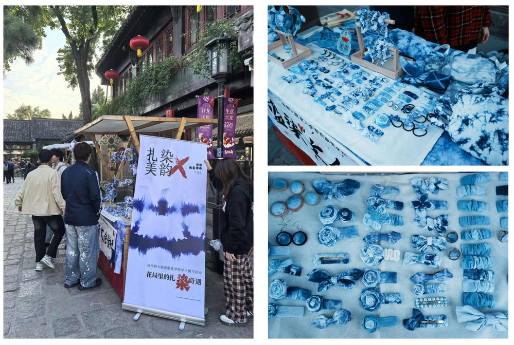 目前,“蓝染文创社”已在扬州的个园花局里、宋夹城等知名景点设立了创作与展销摊位,学生们通过亲身参与从面料蓝染、款式构思、成品打造到市场推广的全过程,深刻体会到非物质文化遗产不仅是民族文化的瑰宝,更是开启就业创业的新通道。社团社长曹梦娇同学表示,蓝染工艺不仅是一项手工技艺的实践,更是一种对先辈智慧的致敬与传统文化精髓的传承。在这个过程中,每一位参与者都在用自己的方式讲述着古老技艺与现代生活和谐共生的美好故事。作为新一代的青年,我们有责任更有热情为中华传统文化的传承与发展尽自己的力量。