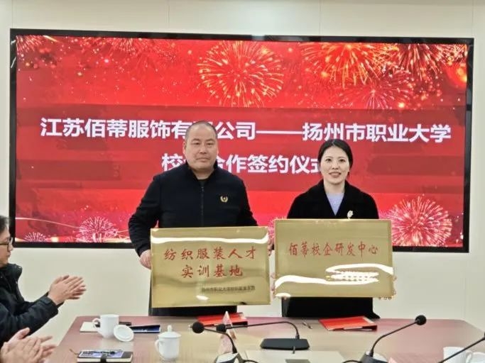 签约仪式上,纺织服装学院党总支副书记、院长戎丹云与张洪忠分别介绍了纺织服装学院和佰蒂服装公司建设发展情况,随后双方签订校企合作协议,并举行纺织服装人才实训基地、佰蒂校企研发中心揭牌仪式。